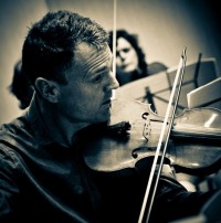 De publieke belangstelling viel wat tegen maar het resultaat van de workshop "geïmproviseerde-muziek" van Tim Kliphuis was geweldig. Bij voorbaat waren de gemoederen hooggespannen bij de kleine 30 aanwezige deelnemers. De goede ervaringen van het vorige jaar beloofden veel goeds. De verwachtingen werden nog overtroffen. Tim had tevoren een vijftal nummers voor strijkorkest gearrangeerd en het was de bedoeling dat die uiteindelijk zouden worden uitgevoerd met begeleiding van de driemansband, viool, gitaar en contrabas. De gipsy-stijl van de op de "Hot Club de France" van Stéphane Grappelli gestoelde manier van spelen vergde een behoorlijk aantal aanpassingen bij ons klassiek geschoolden maar gaandeweg de dag kreeg de groep een en ander steeds beter voor elkaar. Enkele nummers moesten voorzien worden van improvisaties door de deelnemers zelf wat, na wat aarzelende pogingen, bij de meesten toch een aardige noot opleverde. De opmerking: "Alles mag!" droeg wel bij aan het loskomen van de gemoederen tijdens dit voor deze of genetoch wat onwennige onderdeel. Het resulteerde tijdens de "Hoedown" van Aaron Copland, door Tim bewerkt en voorzien van een aantal klassieke uitstapjes, in een kakofonische massa-improvisatie die, wonder boven wonder, uiteindelijk toch weer naar de oorspronkelijke versie van het stuk terugkeerde. Dat deze vorm van Jazz niet alleen virtuoos van karakter kan zijn maar ook een lyrische vorm kent bleek uit het: "Souvenir de Villingen" van Grappelli. Daarnaast klonk het op de Jig geïnspireerde: "Couscous and Butter", een Schotse melodie in een vrolijke 9/8 maat. Indrukwekkend was : "Astor’s Dream" van Tim zelf. Een hommage aan Astor Piazzolla en diens muziek, die als Tango Milonga was verwerkt in dit stuk. Duke Ellingtons: "Caravan" tenslotte werd in de bewerking van Tim van een evergreen omgetoverd in een actueel Jazzy nummer vol enthousiasme bijgestaan door de aanwezige strijkers. Behalve de vijf genoemde stukken kregen we van het trio zelf ook nog enkele geweldige nummers voorgeschoteld, uiteraard op Tims onnavolgbare wijze uitgevoerd.